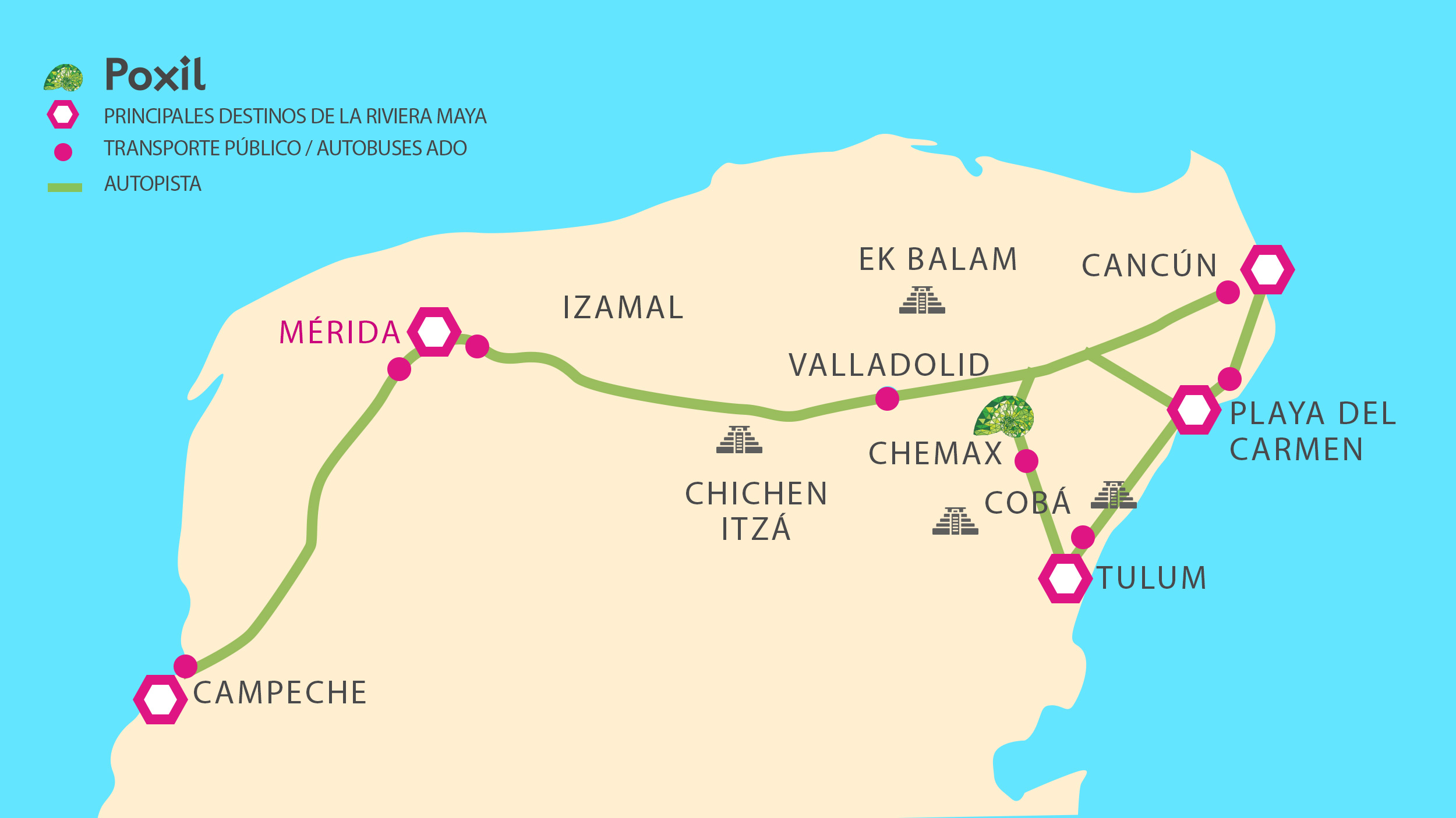 Getting to Poxil Ecoaldea is simple and convenient. Thanks to our close proximity to Chemax (just 2.5 km away), residents and visitors enjoy access to regular public transportation options that connect our eco-community with key destinations throughout the Riviera Maya, including Tulum, Playa del Carmen, Cancun, Valladolid, Merida and Chichén Itzá .